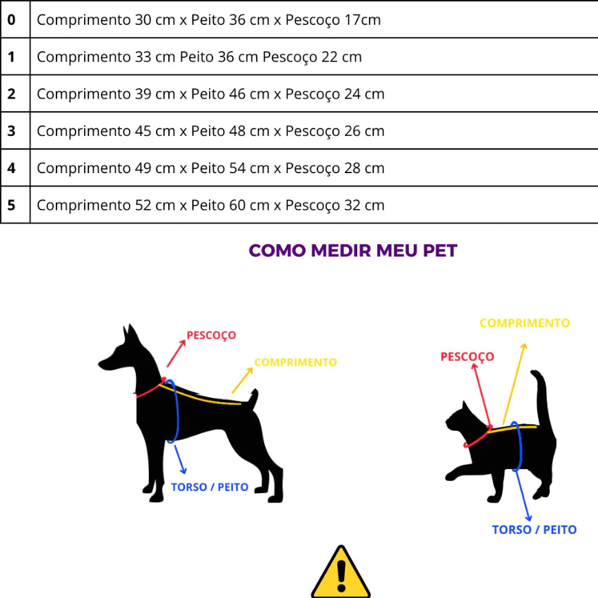 ⚠️ Atenção: Meça sua pet antes da compra para garantir o ajuste perfeito. Use a tabela como referência.